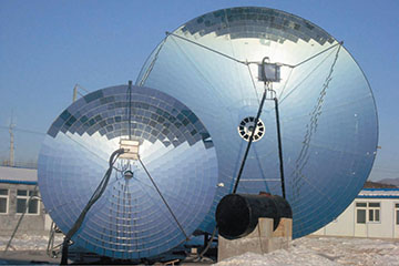 我公司研發(fā)出將太陽能的熱量提供給烘烤設(shè)備作為熱源的供熱系統(tǒng)。該系統(tǒng)以導(dǎo)熱油作為熱傳導(dǎo)介質(zhì),通過聚光鏡將太陽能集中到集熱器中,溫度可達(dá)到1500℃-2000℃,導(dǎo)熱油通過集熱器溫度可達(dá)到300℃,將300℃的導(dǎo)熱油儲存在油箱中,進(jìn)行調(diào)溫后,利用循環(huán)泵將導(dǎo)熱油直接輸送到烤房內(nèi)的換熱器中,經(jīng)過風(fēng)機(jī)換熱將熱量帶到烤房內(nèi),通過換熱器冷卻下來的油再進(jìn)入到集熱器中循環(huán)加熱。
